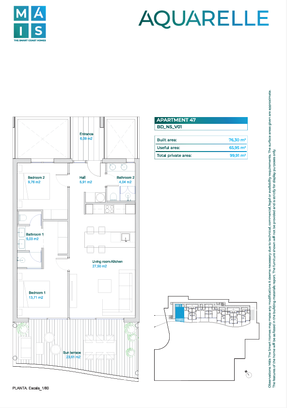 Modern 2-bedroom apartment on the first floor with a large terrace and beautiful views. The bright living room with an open kitchen (27.50 m²) opens onto a spacious terrace (28.26 m²) — perfect for relaxing and enjoying the outdoors. The apartment features 2 bathrooms and a total area of 99.91 m².